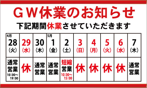 定休日 日曜日、祝日、年末年始、GW、お盆